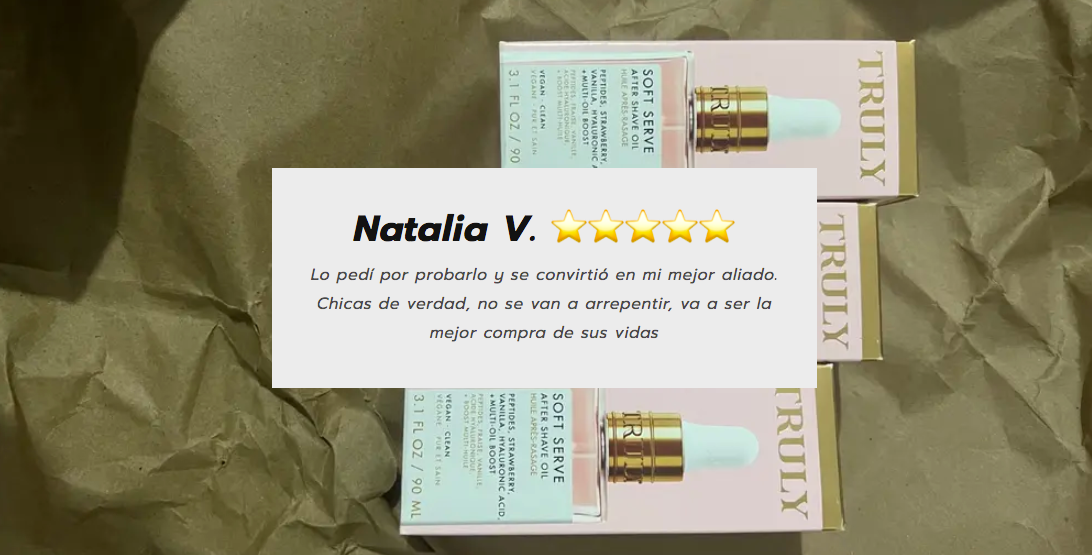 El Aceite Truly hidrata la piel en profundidad, previniendo irritaciones, manchas y foliculitis (vellos encarnados) en las zonas más sensibles del cuerpo desde la primera aplicación.